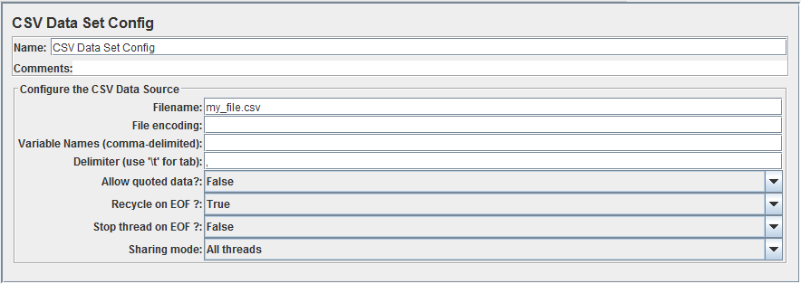 - Add a CSV Data Set Config element (Test Plan -> Add -> Config Element -> CSV Data Set Config). Fill Filename field to match your CSV filename. You can leave the rest of the fields as they are.