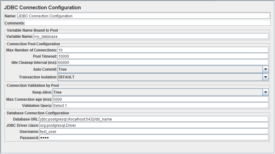 - Add a JDBC Connection Configuration element (Test Plan -> Add -> Config Element -> JDBC Connection Configuration).For Variable Name field, use a name that you will later use with the JDBC Requestelement. I will use my_database in this example.In Database URL field, enter your database connection string. For a local PostgreSQL database, it will look something like this: jdbc:postgresql://localhost:5432/db_nameIn JDBC Driver class enter the java path to driver class. For PostgreSQL driver this is org.postgresql.Driver, refer to your JDBC driver documentation for other databases.Finally, enter username and password to the appropriate field.