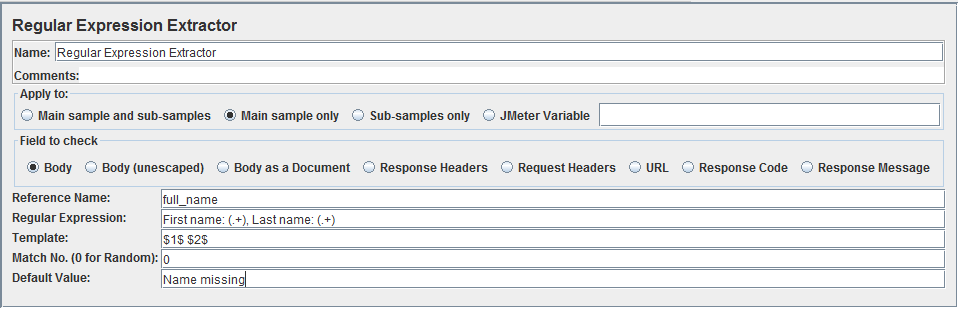 - Add an Regular Expression Extractor element (HTTP Request -> Add -> Post Processors -> Regular Expression Extractor).In Reference name, enter the variable name of the extracted value. You can reference it in other elements with