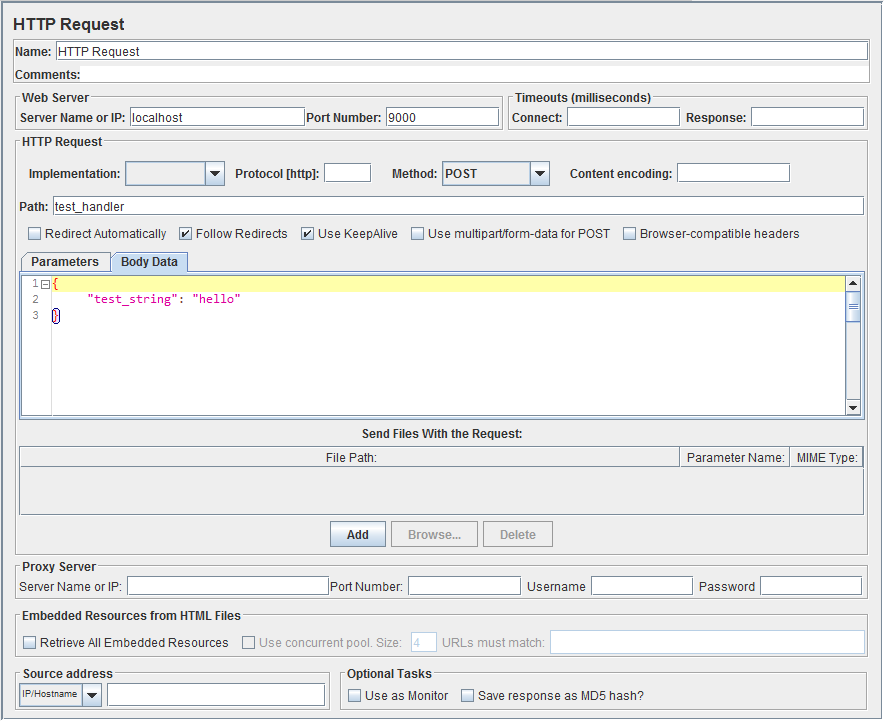 - Finally, add an HTTP Request element (Thread Group -> Add -> Sampler -> HTTP Request).Here you can configure server IP, path, your HTTP method (GET, POST, PUT, DELETE) and add your request data to Body Data field.
