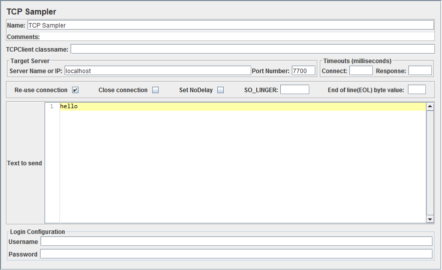 Opening a TCP connection and sending data works similarly to the HTTP testing workflow, just instead of HTTP Request use the TCP Sampler element.
