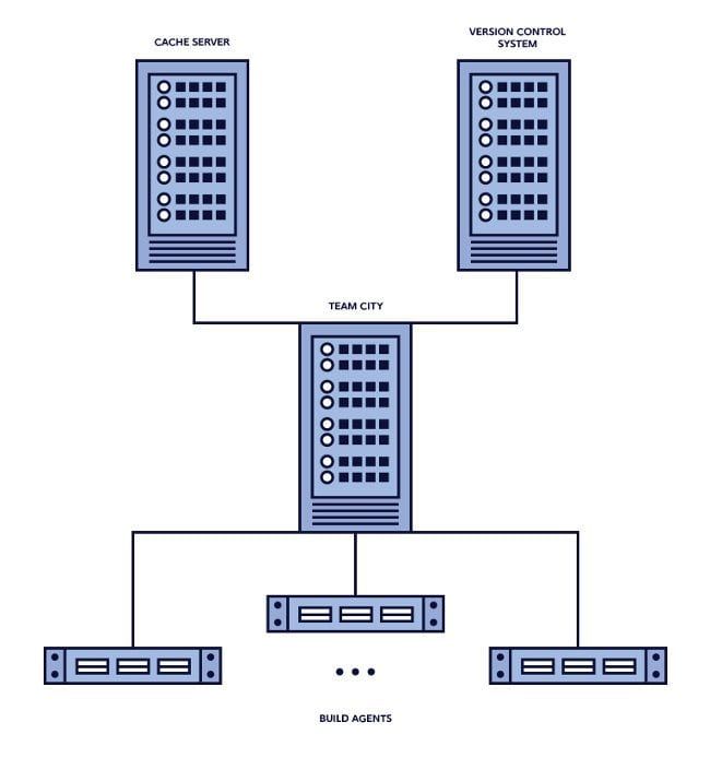 Build server is the heart and soul of the system, since it monitors source control (git in our case), coordinates between multiple build agents and executes builds. CI servers are excellent for this, even if you don’t want to use anything CI specific. In our case, we compared Bamboo, Jenkins and TeamCity and finally decided on TeamCity due to its flexibility and ease of use, but pretty much any CI server should work great depending on the feature set that you need.