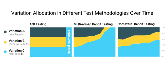 Contextual bandits have become a popular approach to recommender problems, where there are many possible items to offer and there is frequent interaction with the users, e.g. via click/no-click or purchase/no-purchase events. The key idea is that improvement of the recommender policy is achieved in a trial-and-error fashion by taking user features into account. In general, bandit algorithms can be thought of as “online self-improving A/B testing”. A somewhat cartoonish way of comparison of the usual A/B testing, standard multi-armed bandit approach (online improvement not taking individual user features into account) and contextual bandit approach (online improvement taking individual user features into account) could be viewed as follows.