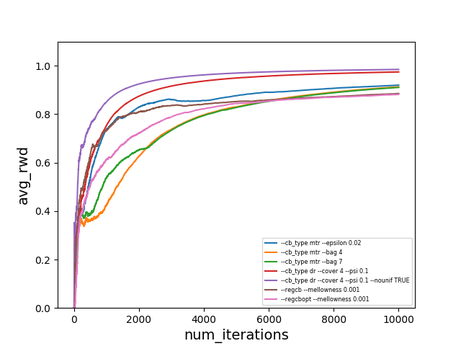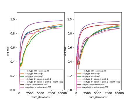 $\text{avg_rwd}(t)$ is the average reward after $t$ iterations ($t$ examples). The dataset does not seem to be particularly hard, but it’s still nice to see that these algorithms work in practice. What’s more interesting is that offline evaluation seems to work as well - of course the estimates are a bit off, but still (surprisingly) close. The results below are on the same dataset with the doubly robust estimator [6]. On the left is the actual performance and on the right is the offline performance of the same algorithms, using the logged data of a different ($\epsilon$-greedy) exploration policy.