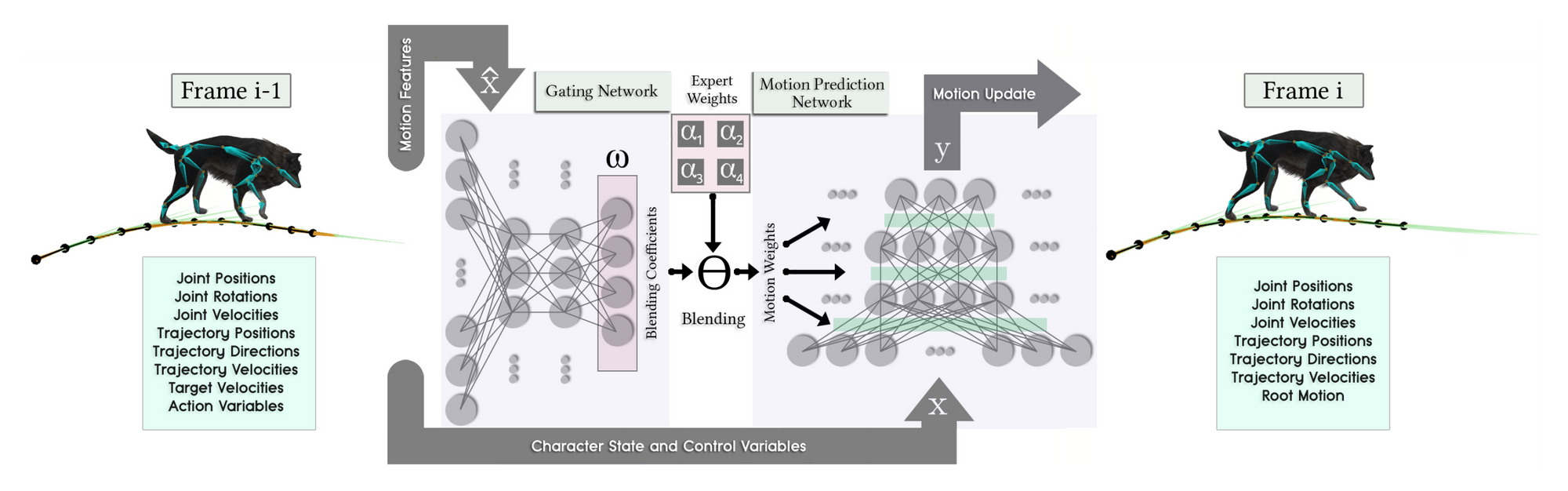 Although no explicit recurrent model is used, the network still infers the motion state. The key idea is that the whole model consists of two three-layer feedforward neural networks, the gating network and the motion prediction network. They interact in the following way: the first one is used to obtain the implicit phase of locomotion, which is represented by a $k$-dimensional vector. Next, the output coefficients are used to blend the weights of $k$ different neural networks as a linear combination. For instance, in the diagram above, $k=4$.