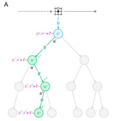 MuZero learns three specific functions (subscripts denote actual rollout time steps, superscripts denote tree search iteration):