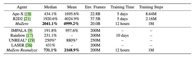 MuZero outperforms existing RL model-free algorithms in Atari games, and achieves AlphaZero level of performance in chess, go (slightly outperforming AtariZero here) and shogi, and, of course, greatly outperforms humans.