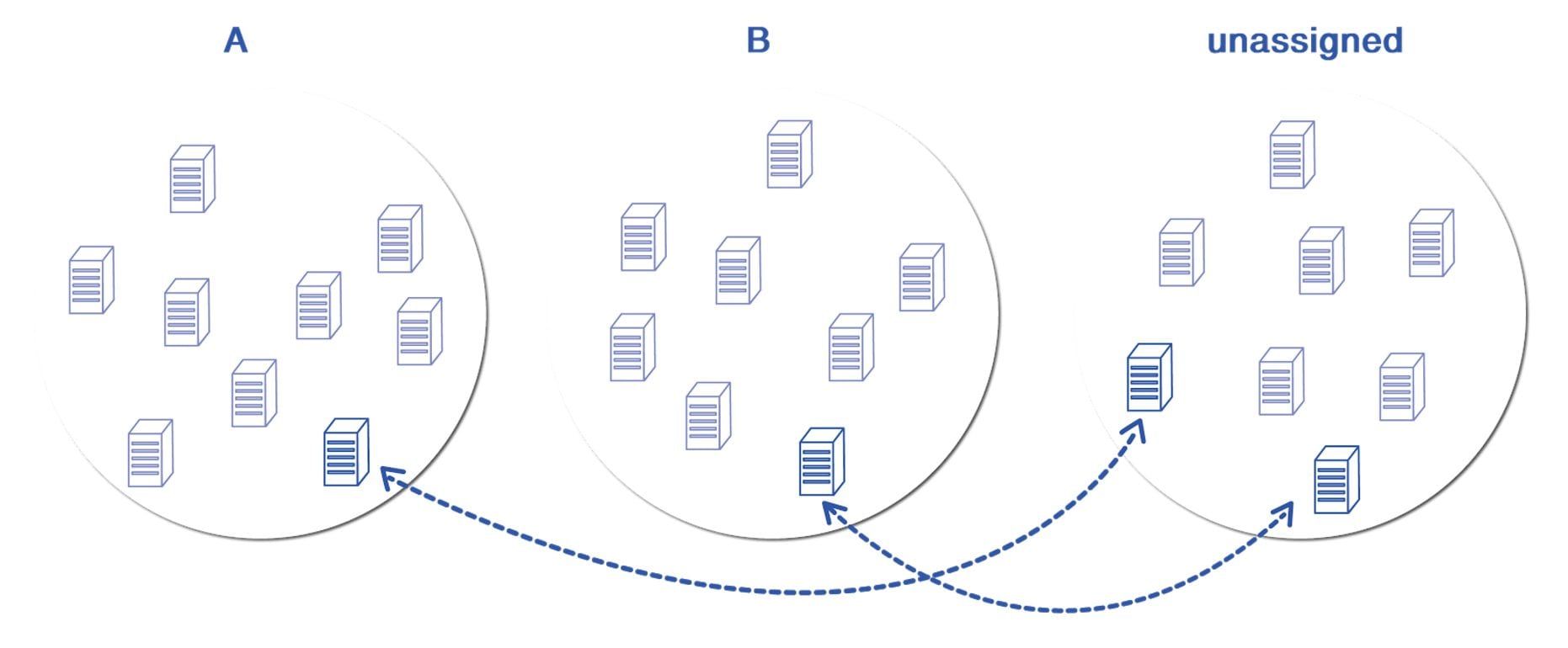 - Start with A, B and Unassigned server buckets randomly initialized