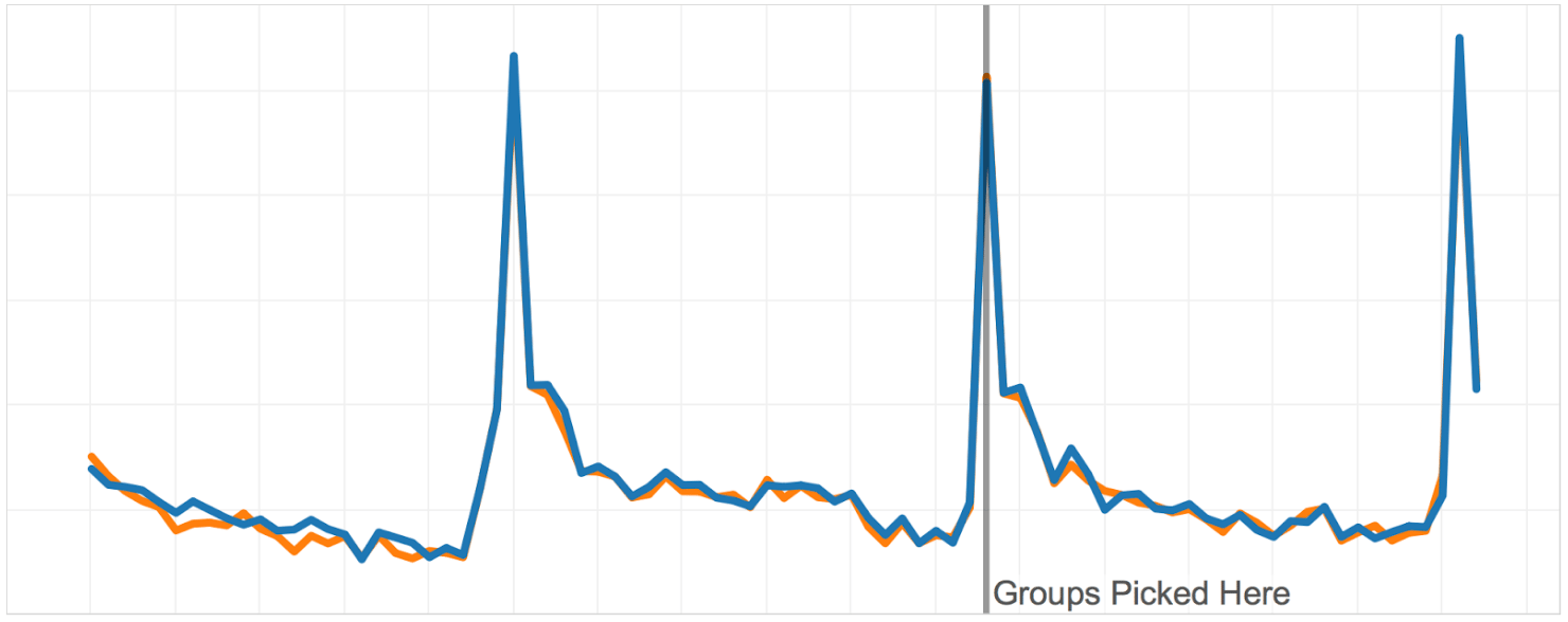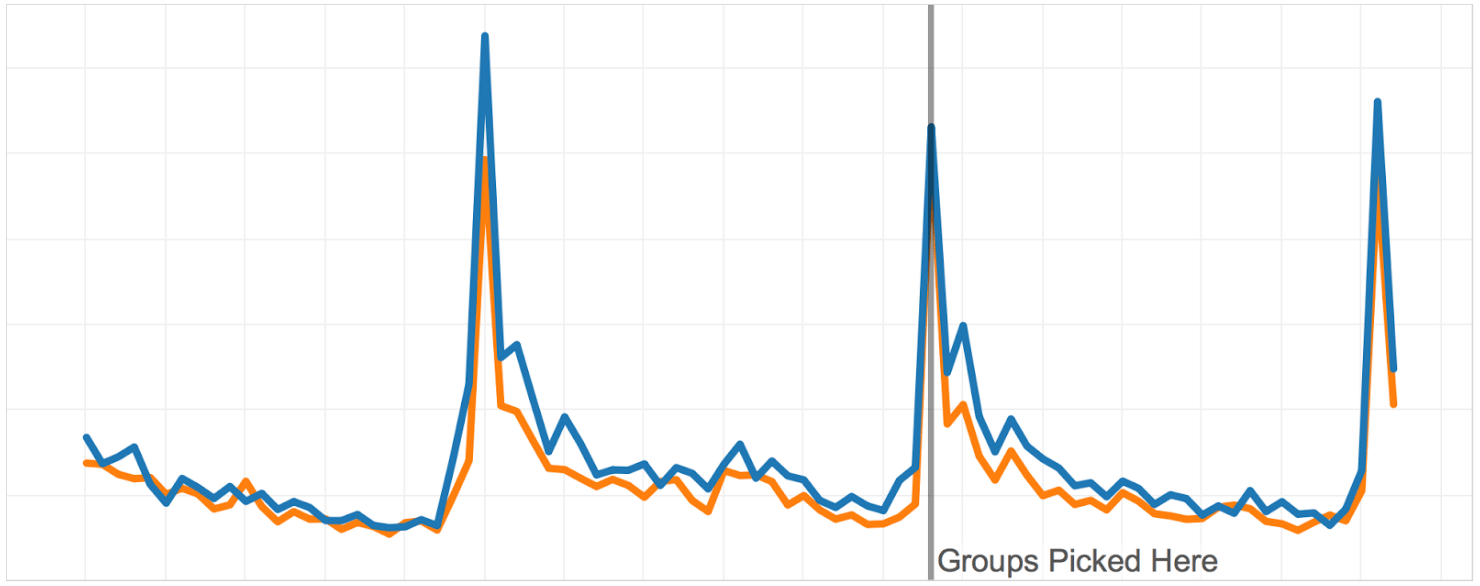 On the graph below, you can see the groups obtained with our novel algorithm. You can see how similar the groups are on the historical data we optimized on. That’s to be expected. What’s even more cool is that the groups remain similar for weeks after we picked them. That practically means that if we notice any difference after we launch the test, we can rest assured that the difference is the consequence of the new feature and not statistical noise or a systematic difference that existed prior to the A/B test.
