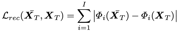 Two types of losses are used to train the model. The first one is the so-called reconstruction loss and controls wherever the output has similar visual features to the desired output, which is a common trick in problems such like super-resolution, colorization or style transfer. The loss is defined as follows