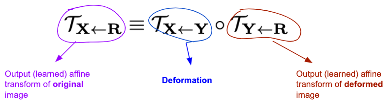 Another loss that is used is the equivariance loss. So far, we have been talking about “affine transformations” that are used to "move segments” of the source image, but of course this is just the desired outcome and the transformations were otherwise unconstrained. The equivariance loss is the key ingredient in unsupervised keypoint detection that constraints the transformations in the following way: one uses the fact that the output affine transform of the segmentation module should be robust to composition with random deformations (random in a certain class, more precisely in the class of thin spline transformations), so that it should hold that