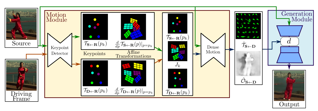 [2] is based on ideas that appeared already in [1]. The first order motion model uses a motion module, which outputs the keypoints and its corresponding transformations, but no segmentations masks per se. Note that segmentation has to still be done implicitly though, since “moving a keypoint” corresponds to “moving its neighbourhood” at the same time. The output of the motion module is then applied in a similar way to the one described above to transform the source image into the target frame.