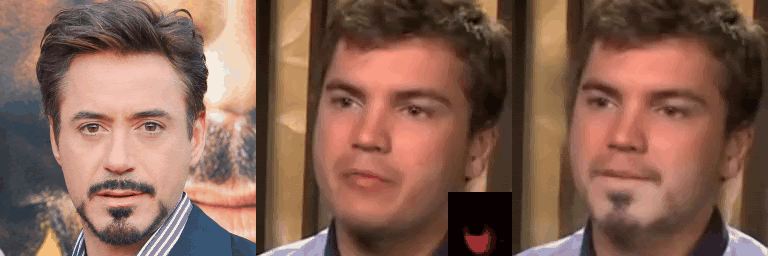 Note that the model is trained only with videos, i.e with target frames taken from some video and source frames from the very same video. During inference, however, one may input any source frame and target frames to obtain a sequence of reconstructed target frames. The hypothesis is that if we have a source frame and a target video viewing an object consisting of similar segments, this will allow the target video to drive the source frame in a meaningful and consistent way. Except for consistent movement within segments, segmentation has one more application. One can select only certain segments to be reconstructed while using the original target frame otherwise. This makes it possible to do things such as face swapping, beard swapping and so on, as in the examples above.