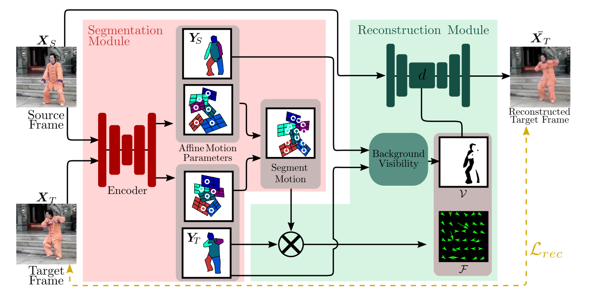 In a nutshell, the model takes in a source frame and a target frame, and outputs a reconstruction of the target frame using the source frame and "motion" between the source frame and the target frame. This is done by performing segmentation of both images and finding corresponding affine transformations between the segments.
