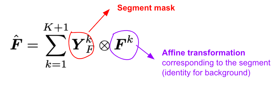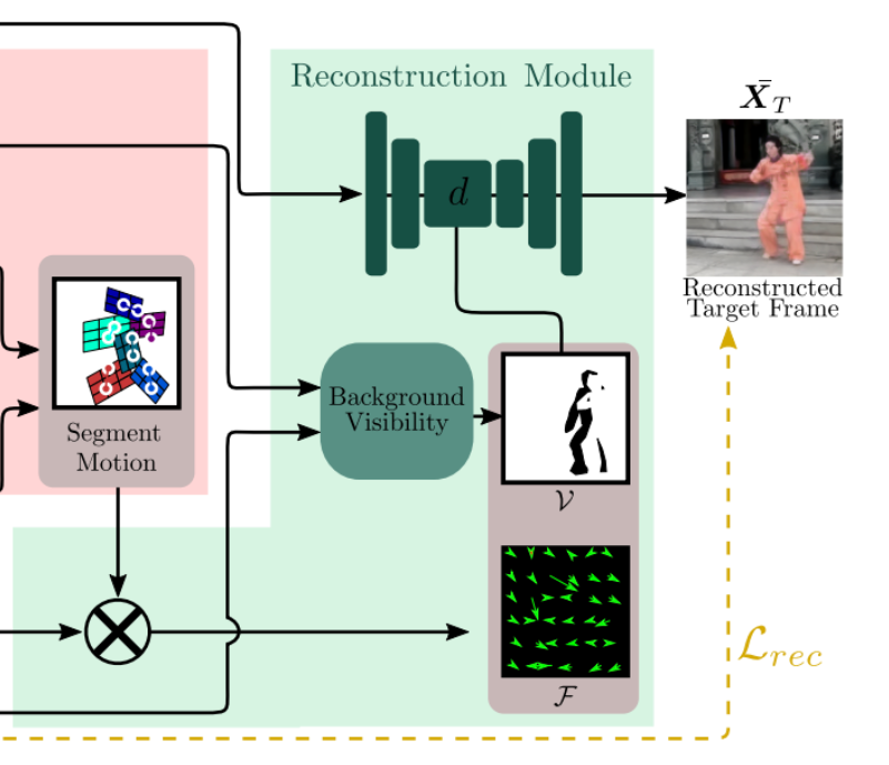 In the reconstruction module, the motion of each segment is combined with the segmentation to obtain the optical flow between the source and the target. This flow is later applied to the source image in order to obtain the reconstruction of the target frame.