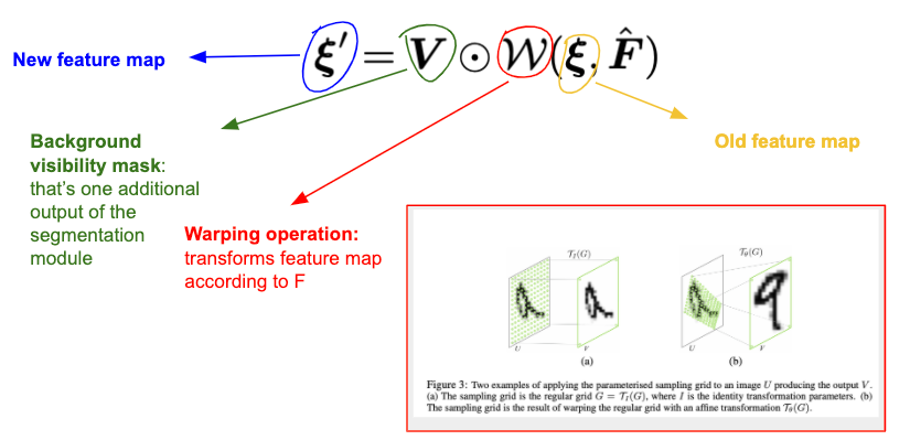 where $\xi$ is the original feature map, $\xi'$ is the new feature map and $\mathcal{W}$ is the warping operation from Spatial Transformer Networks paper [5], which transforms $\xi$ according to $\hat{F}$. Note that implementing $\mathcal{W}$ is not trivial (what does it exactly mean to apply an optical flow to an image and how to utilize GPU for that?), see [5] for details. It's available, for example, in torch.nn. The background visibility mask $V$ is yet another output of the segmentation module and predicts which pixels of the background are occluded because of the motion. In other words, the occluded pixels are simply the ones that belong to one of the foreground segments of the source image and belong to the background segment of the target image. Multiplying by this mask one simply does not allow the non-visible features to impact the reconstruction.
