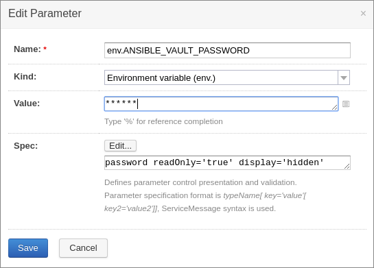 Now, the only thing that we need to do in a TC build to be able to use Ansible Vault, is to define an environment parameter ANSIBLE_VAULT_PASSWORD to the value of your Vault passphrase. To do that, you just need to edit the configuration of your build, click on Parameters on the sidebar and create an Environment variable, like this: