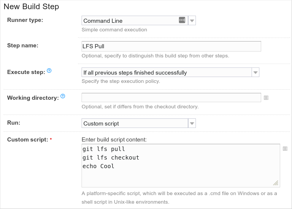 This step runs three commands, and you would expect that if any command failed, then the whole step would also fail. But that isn't the case. It will actually fail only if the last command fails, and because that command is echo, that will likely never happen. Because of this, the above two git lfs commands can fail and TC will still continue like everything is ok. This means that you don't have the correct source files to work with and who knows what will the outcome of the build be.