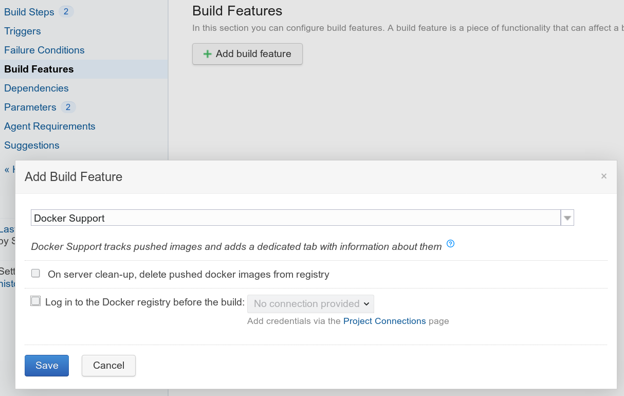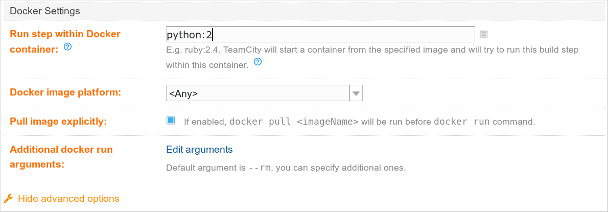 You can use many public images available on https://hub.docker.com/, or build your own. In here we are using Python 2 image. When this build step is run, TC will run the container and mount the whole build directory into the Docker container's working directory. This means that you will always have a clean and identical environment.